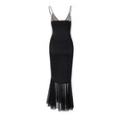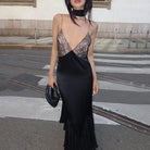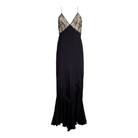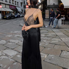 Sultry nights call for a dress like this. Unveil your mysterious side in an evening silhouette designed to enchant. With its silky glide, lace-trimmed neckline, and flared hem, this piece captures the essence of midnight elegance—perfect for moments that linger long after the lights dim.