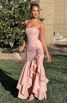 Make a breathtaking entrance with the Strapless Cascade Maxi Dress, where timeless glamour meets modern sophistication. Featuring a sculpted strapless bodice, cascading ruffles, and a daring thigh-high slit, this gown is designed to captivate at every formal event. Confident, striking, and effortlessly refined, it’s your perfect evening statement.