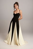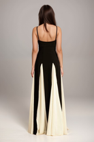 Step into sophistication with the Maris Timeless Elegance Maxi Gown. Perfect for evening events, this gown features a stunning color block design with flowing white panels that create a graceful, flattering silhouette. Made from a luxurious satin blend, it offers both elegance and comfort for any formal occasion.