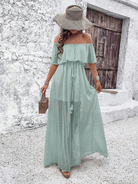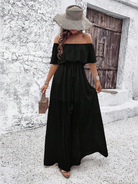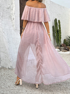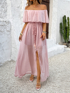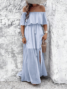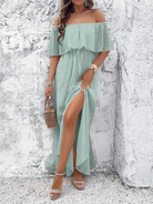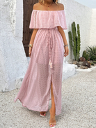 Elevate your warm-weather wardrobe with this off-shoulder maxi dress, designed to offer a balance of elegance and bold charm. The timeless polka dot print and flattering high slit make it a standout piece for summer soirées, evening events, or stylish daytime gatherings.